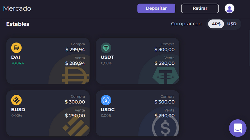En la Tienda podés acceder a DAI, USDT, BUSD, USDC de la forma más simple. Depositar pesos a través de una transferencia y ya las podés adquirir. Lo mismo si necesitás vender, con dos clicks ya pasás de cripto a pesos y los enviás a tu cuenta.