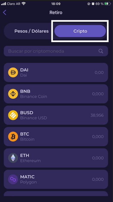 Después vamos a la parte de cripto y nos van a aparecer todas las monedas. En este caso vamos a retirar BUSD, por lo que la seleccionamos. Si nos preguntamos cómo retirar USDT o cualquier cripto, funciona de la misma forma.