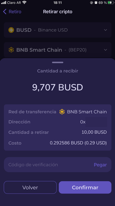 Vamos a ver un resumen de todo. Arriba la cantidad neta que va a recibir la dirección (cripto que mandamos menos el gas fee — costo de la red). Después tenemos la red de transferencia, la dirección, cantidad que retiramos y costo de la misma. El código de verificación es un código de 6 dígitos que nos llega a nuestro mail por motivos de seguridad. Lo pegamos, confirmamos la transacción y listo!