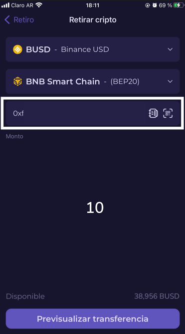 Ahora pegamos la dirección que va a recibir las criptos. Atención acá porque esta dirección tiene que poder recibir cripto por la misma red: BNB Smart Chain. Esto es MUY IMPORTANTE. Si puede recibir, continuamos poniendo el monto a transferir y seleccionamos abajo de todo PREVISUALIZAR TRANSFERENCIA.